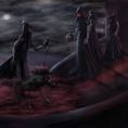 Um hier das (von mir empfundene) Unheimliche, seinen Kern herauszuarbeiten und auszudrücken, habe ich zunächst als Grundfarbe eine Art "infernalisches Rot" in diversen Abstufungen verwendet. Des Weiteren habe ich die Köpfe der Figuren etwas vergrößert. Den Blumenkorb habe ich durch einen Kopf ersetzt. Woher die beiden Schwestern kommen und wohin sie gehen, ist unklar - auch das erhöht den Grad des Unheimlichen ... in gewisser Weise sind es "infernalische Schwestern".
