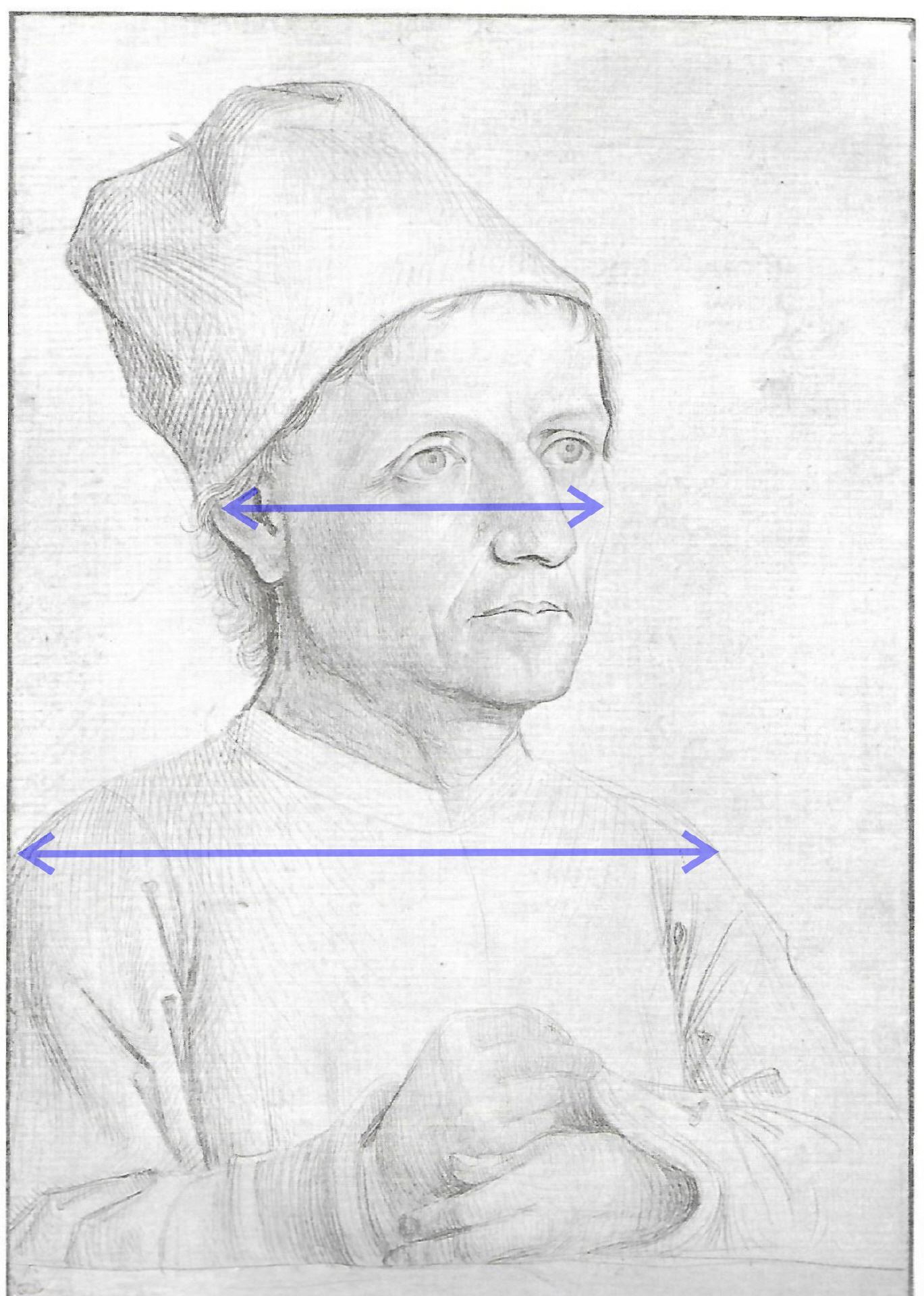 Bei der Betrachtung der hier abgebildeten Zeichnung hat mich immer etwas gestört. Das Problem hier ist der, im Vergleich zum darunterliegenden Oberkörper, übergroße Kopf, so als sei der Kopf eines Erwachsenen auf den Körper eines etwa 12-jährigen Kindes gesetzt worden. Der Kopf hat hier nahezu das gleiche Volumen wie der Oberkörper. Nach den gängigen Faustregeln der Anatomie jedoch müsste die Breite des Brustkorbes (von vorne betrachtet) in etwa drei Kopfbreiten entsprechen.