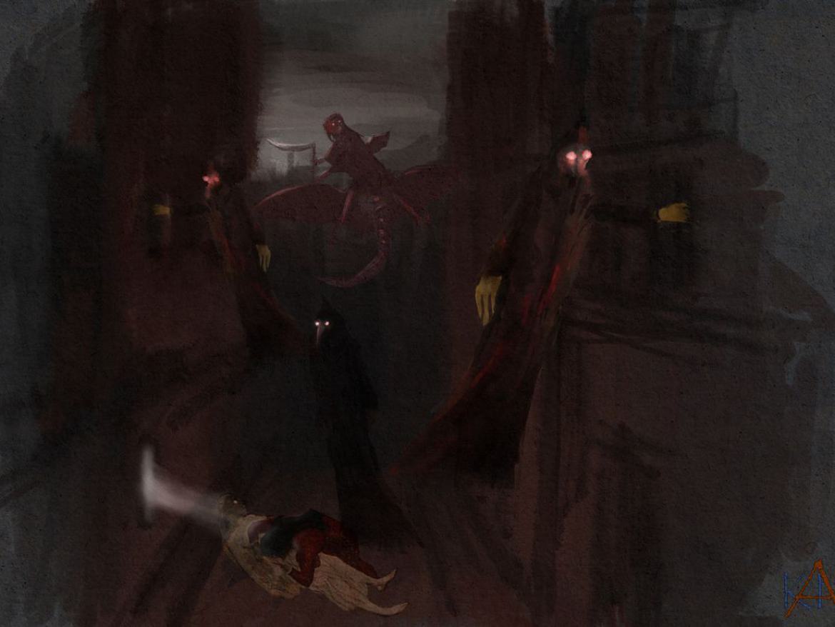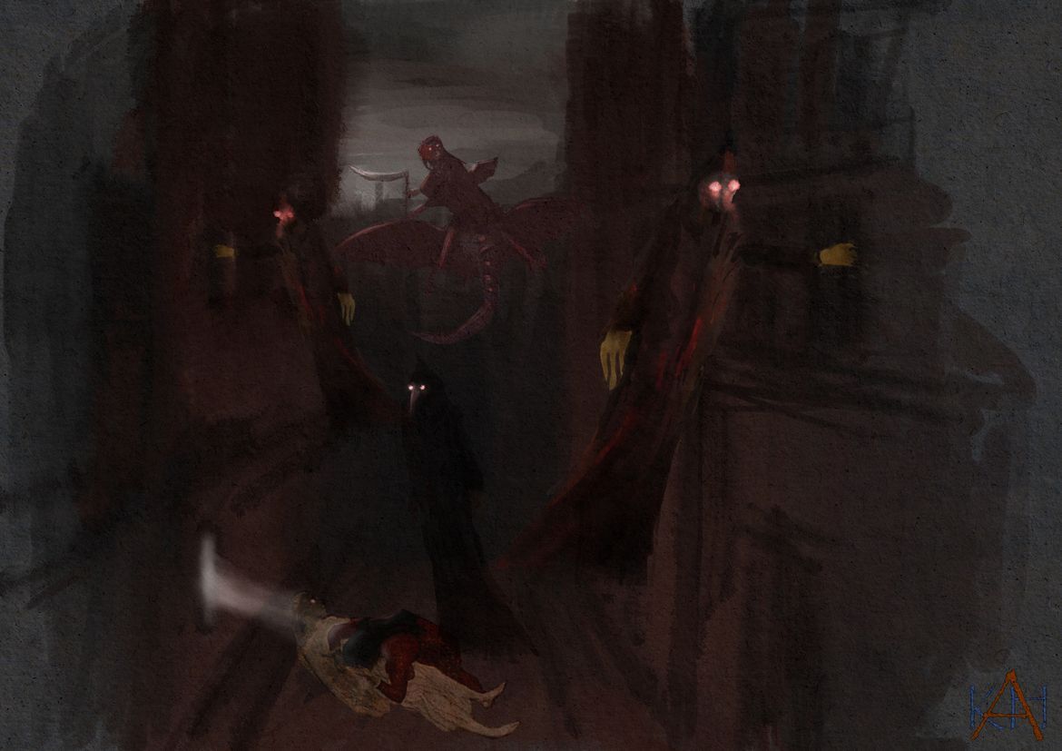 Doch zurück zum Thema "Horror". In meinen Bildern und Zeichnungen zu diesem Thema tritt der bedrohlich-aggressive Aspekt gar nicht auf. Die Figuren oder Akteure treten nicht aus dem Bildgrund, springen den Betrachter nicht an. Aus diesem Grund scheint mir der Begriff des "Unheimlichen" angemessener, auch weil das "Verheimlichen" mit darin steckt, im Sinne eines Verborgenen, latent Bedrohlichen, eines angsterzeugenden, lauernden Nicht-greifbaren - ähnlich einer lauernden, sprungbereiten Spinne. Das ist schwierig in Worte zu kleiden, man muss es empfinden, seelisch wahrnehmen.