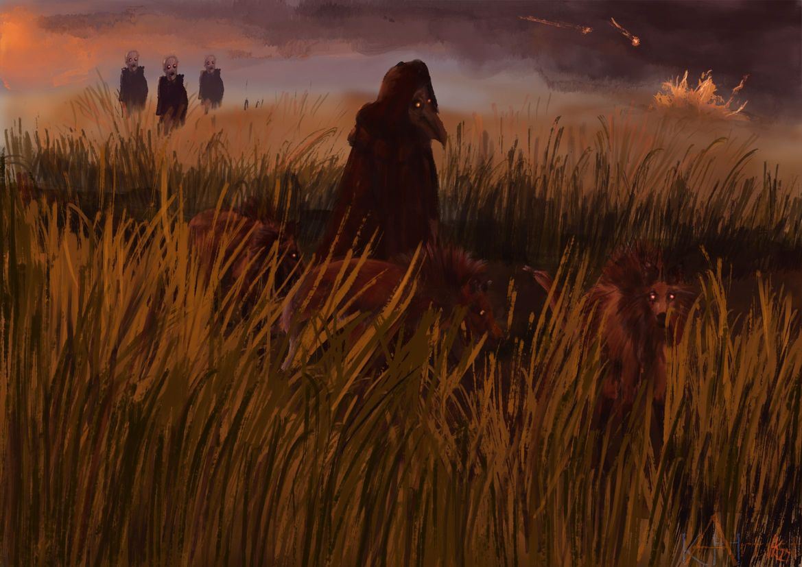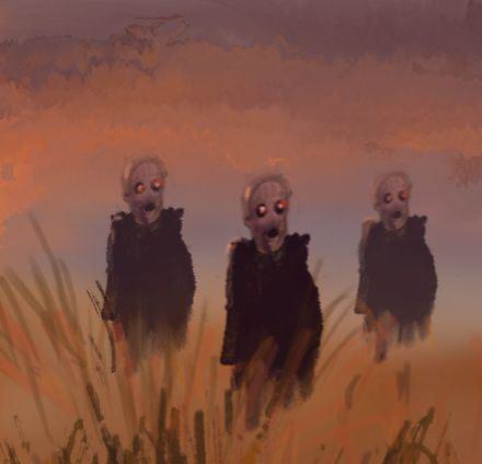 Im ersten Bild, mit den beiden Schwestern ist es die steife, fast hölzerne, puppenhafte Wirkung der beiden Figuren. Verstärkt wird das Potential des Unheimlichen noch durch den dunklen Hintergrund bzw. die im Ganzen eher dunkel gehaltene Szenerie. Die Wolkengestaltung hat bereits etwas leicht Infernalisches.