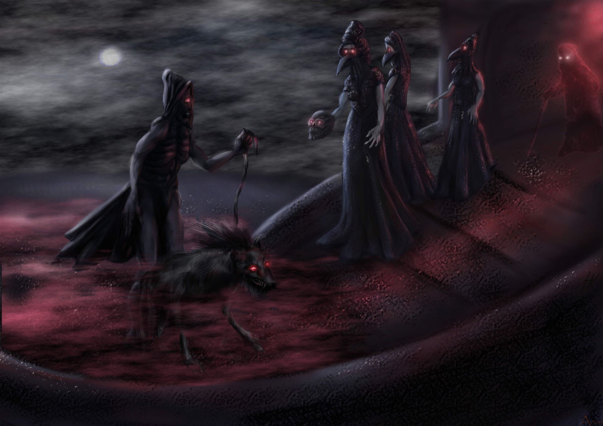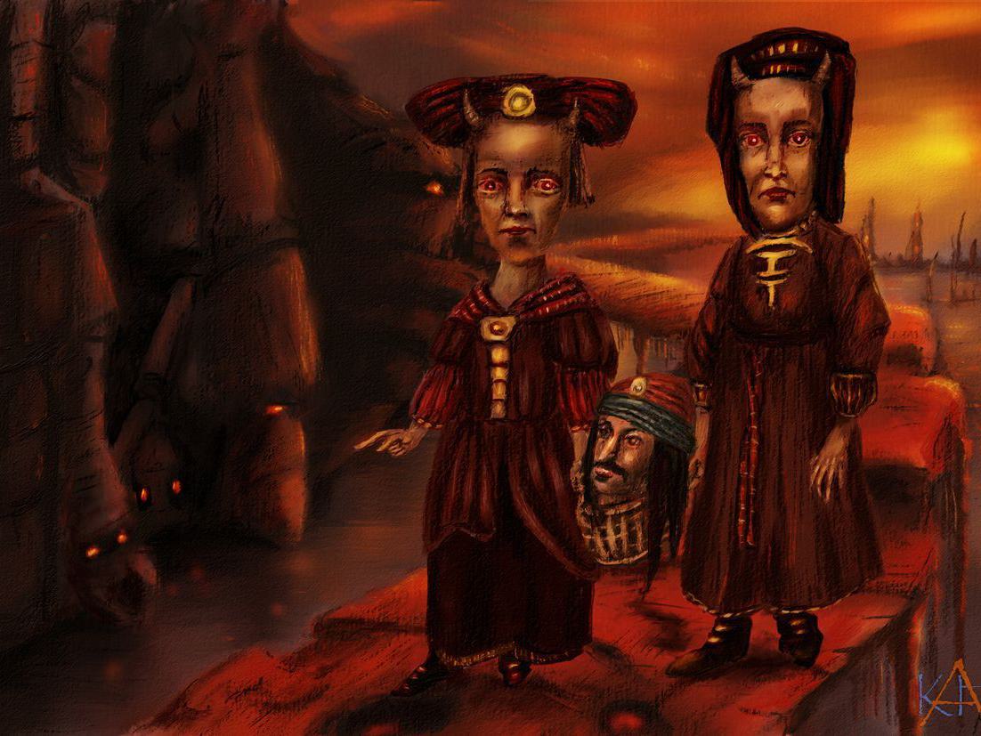 Um hier das (von mir empfundene) Unheimliche, seinen Kern herauszuarbeiten und auszudrücken, habe ich zunächst als Grundfarbe eine Art "infernalisches Rot" in diversen Abstufungen verwendet. Des Weiteren habe ich die Köpfe der Figuren etwas vergrößert. Den Blumenkorb habe ich durch einen Kopf ersetzt. Woher die beiden Schwestern kommen und wohin sie gehen, ist unklar - auch das erhöht den Grad des Unheimlichen ... in gewisser Weise sind es "infernalische Schwestern".