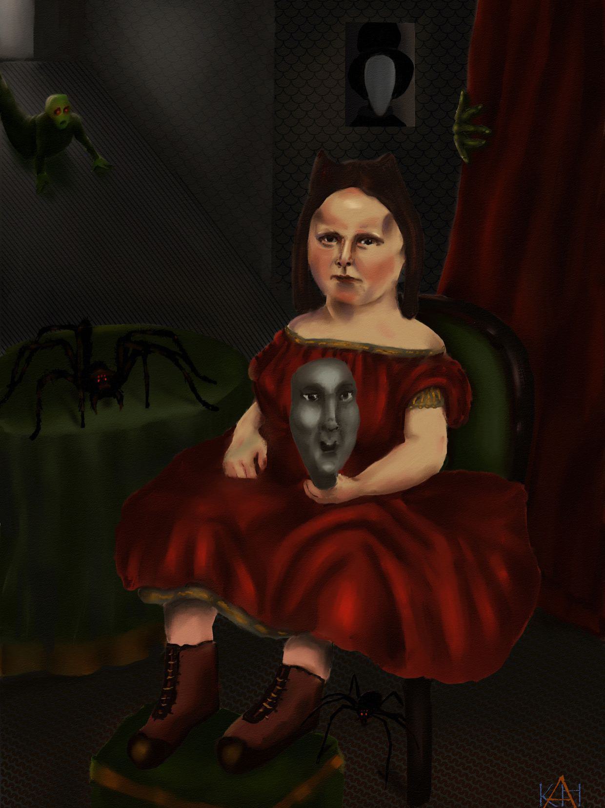 Das Kind selbst bleibt unbeeindruckt von den Gegebenheiten, als seien sie sein natürliches Umfeld. Ein weiteres unheimliches Element, eine Urangst ist die Hand die hinter dem Vorhang hervorkommt, sowie die kriechende Gestalt, die sich aus dem Hintergrund nähert. Hier habe ich versucht die Urangst darzustellen, die sich - in der Wahrnehmung - im Dunkel verbirgt, das, was hinter dem Rücken geschieht bzw. was die Angst-Fantasie sich einbildet. Der Kopf oder die Maske, die das Kind in der Hand hält, ist das Gesicht des Mannes aus dem Porträt, das an der Wand im Hintergrund hängt.