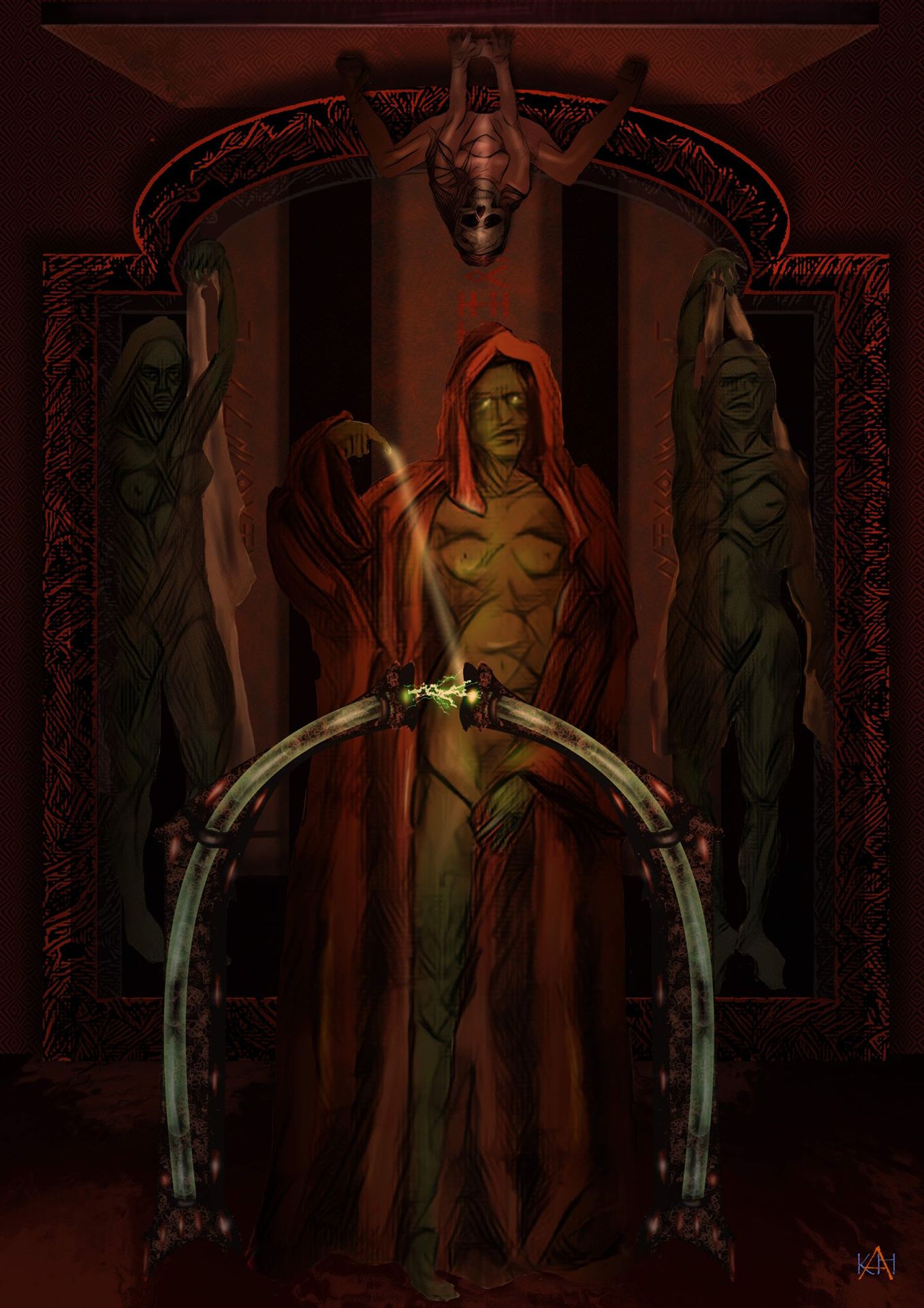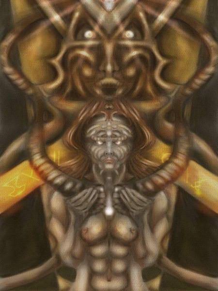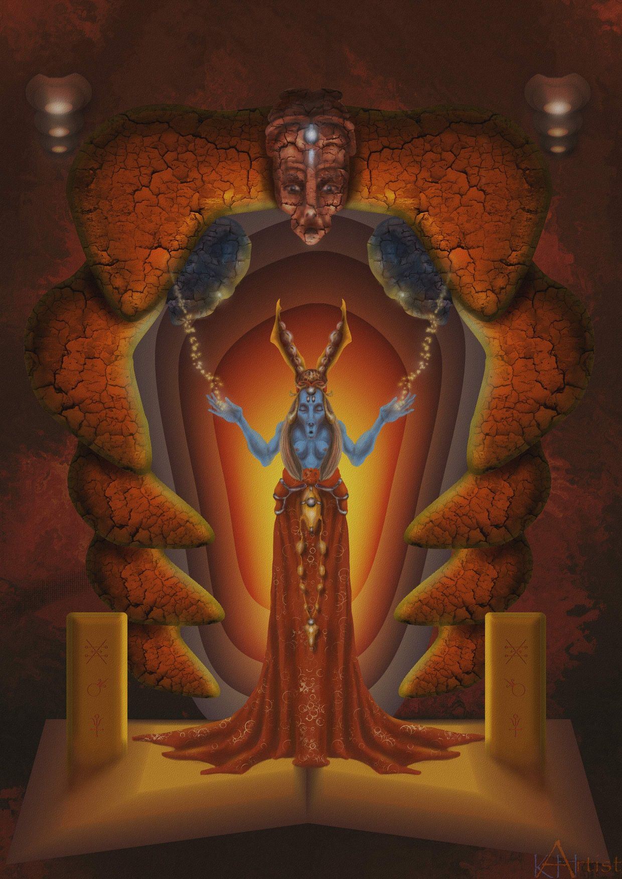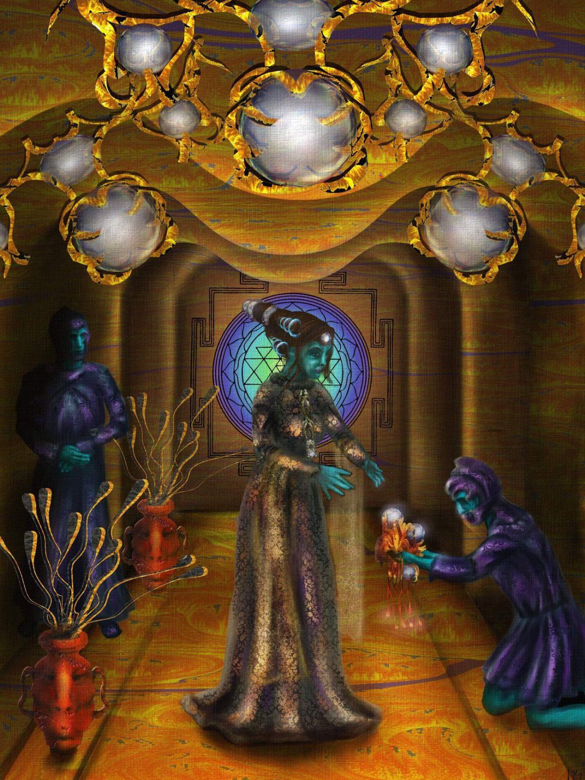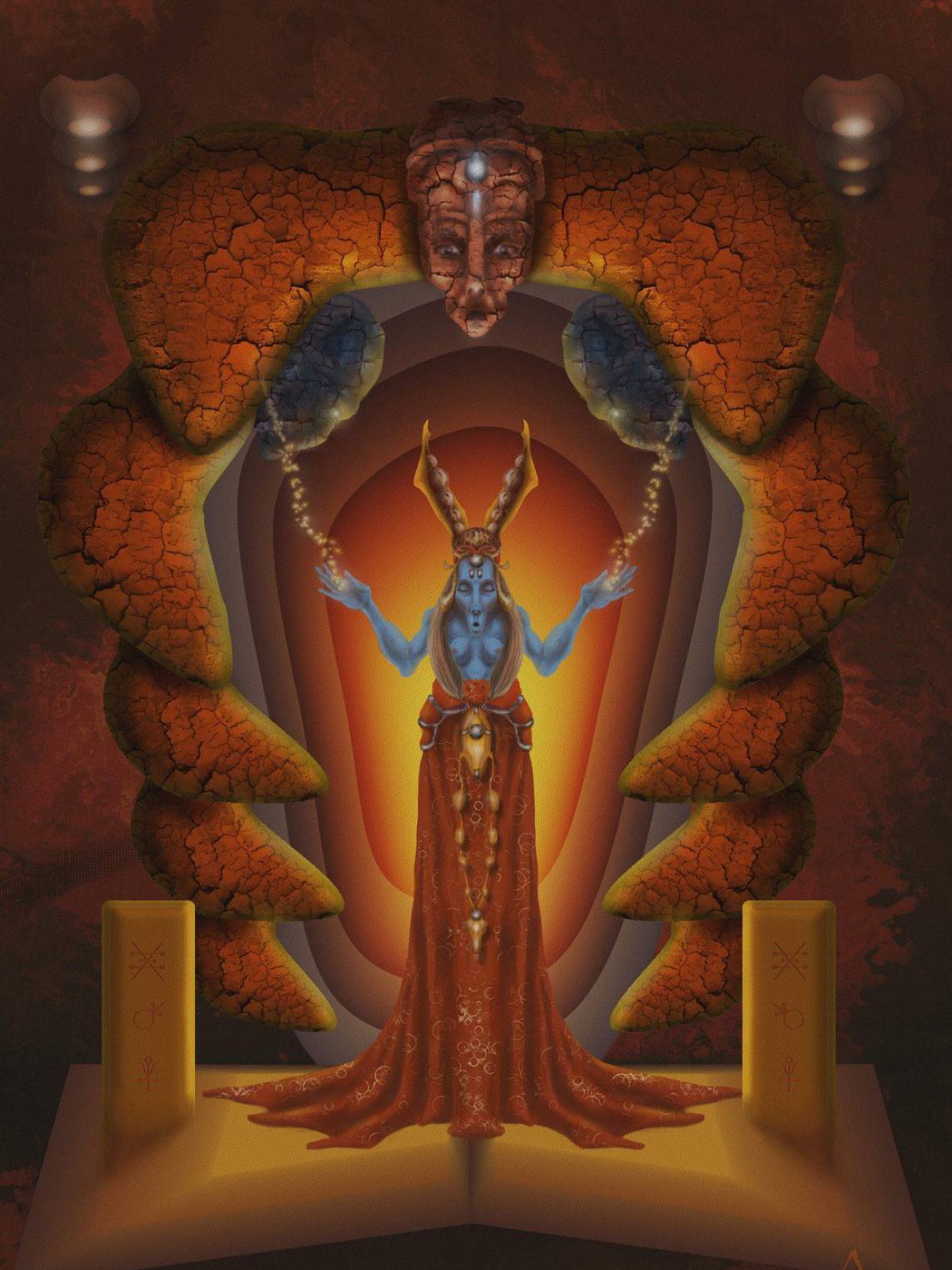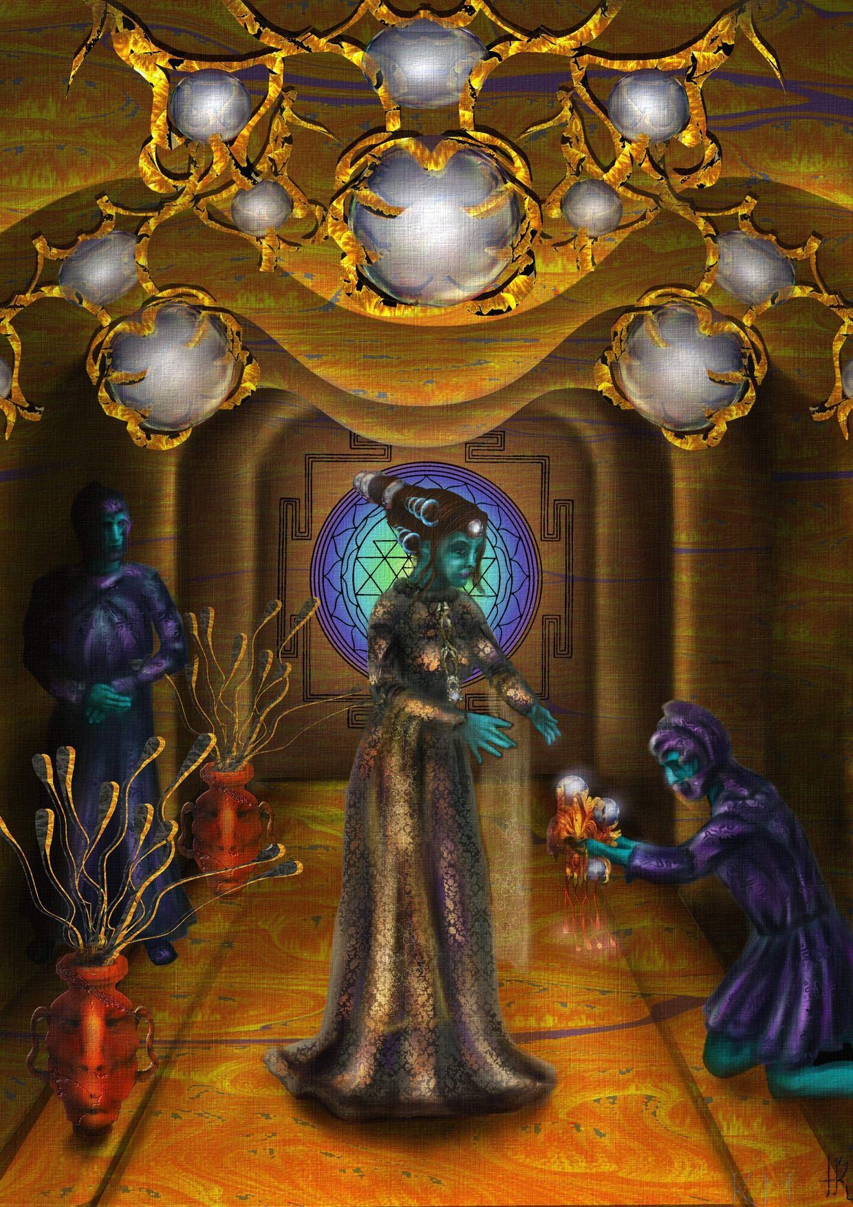 Ich habe dieses Thema hier auf hypothetische Welten transformiert, was mir mehr gestalterische Freiheit gibt, da ich mich nicht an bekannten kulturellen Gegebenheiten der irdischen Geschichte orientieren muss, die mir auch in ihrer Formensprache und ihren kultischen Inhalten nur rudimentär bekannt sind.