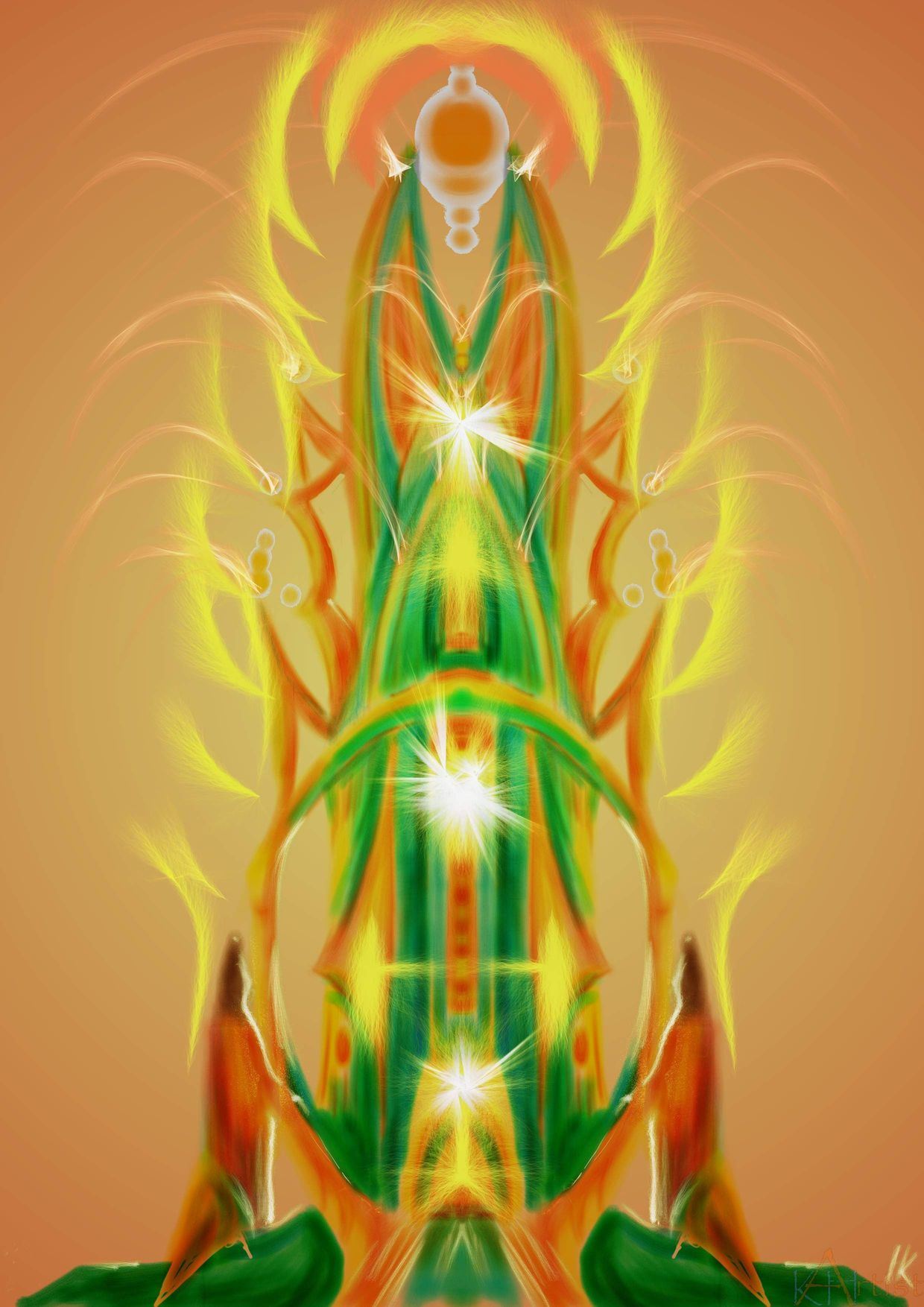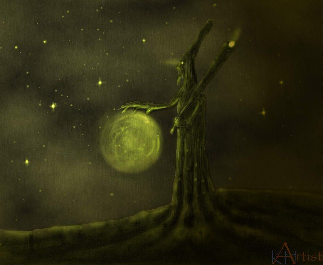 Ein gutes Beispiel für diese Höherdimensionalität der Dinge ist die Darstellung mit dem Titel "Mondmagier" - der Auslöser dieses Bilder war ein ganz gewöhnlicher ausgetrockneter und lebloser auf einer Wiese stehender Baumstumpf, den ich in gewisser Weise ins Magische transformiert habe und ihm somit ein ganz eigenes, verborgenes Leben wieder eingehaucht habe, ihn wieder zum Leben erweckt habe. Womöglich haben alle Dinge auch einfach eine solch höherdimensionale Gestalt, jedoch sieht man nur ihren Abdruck oder Schatten in der uns sinnlich zugänglichen Welt. Taucht etwa eine Kugel durch eine Ebene, so bildet sie Schnittflächen mit dieser, ausgehend von einem Punkt übergehend in sich weitende Kreise wieder zurück zum Ursprungspunkt. Ein Flächenwesen würde diese sich verändernden Flächen sehen, nicht jedoch die Kugel als Ganzes, da diese sich in einer höheren, dem beobachtenden Wesen nicht sinnlich erfahrbaren Dimension befindet, sein Vorstellungsvermögen also übersteigt.